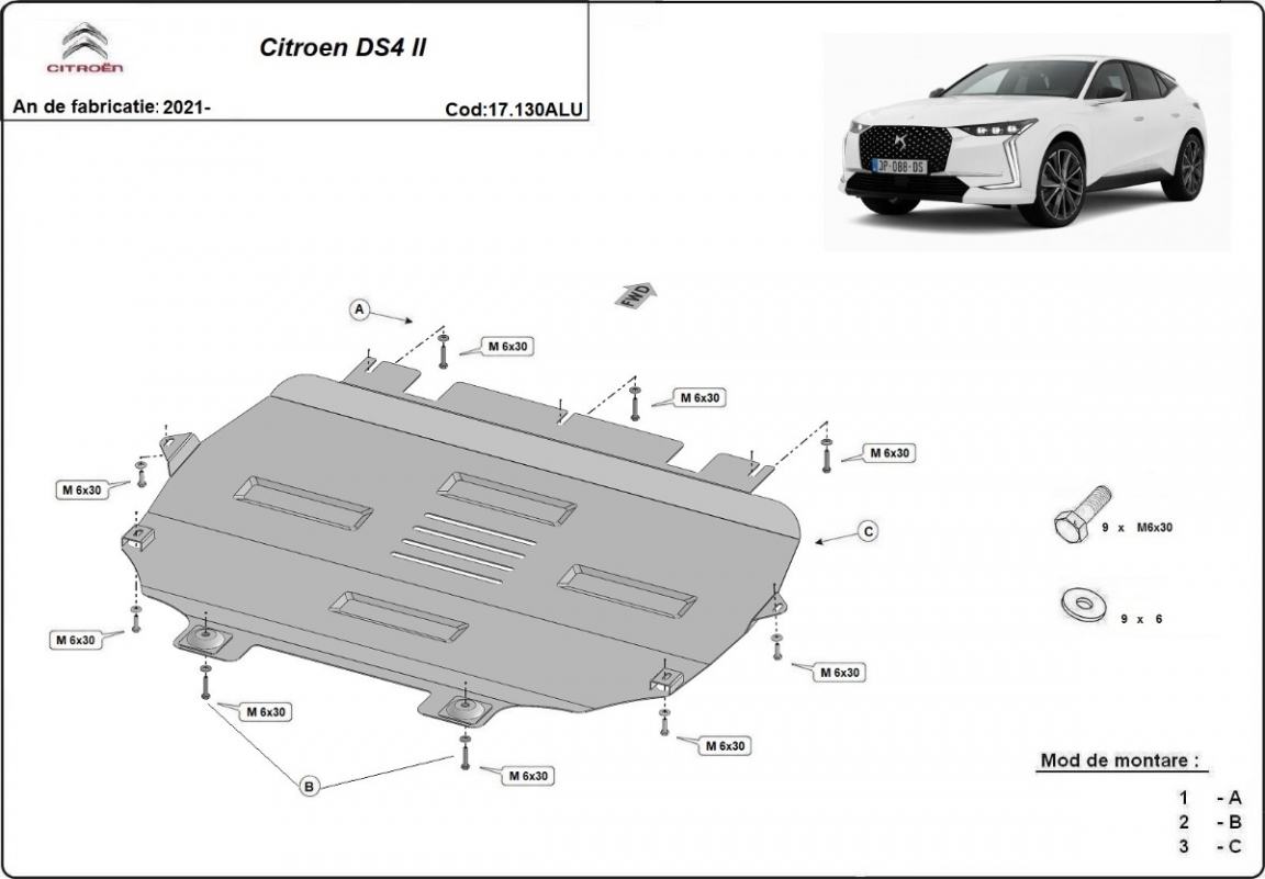 | Chaque voiture a des trous de vis fabriqués en usine pour le montage de la plaque de protection, ce qui rend le montage très facile. Vous pouvez le faire vous-même ou à n'importe quel point de service automatique. |