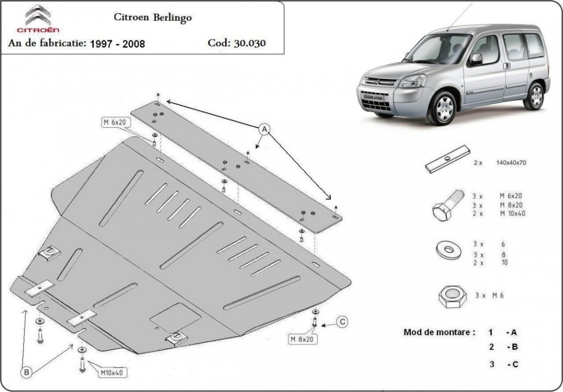 Despite going to the extra effort of checking via email that the guard (code: 30.030) would actually fit a 2007 Citroen Berlingo forte 1.4 litre petrol (a bit of a rarity), and receiving confirmation that it would, I was very disappointed that in fact, it did not. The rear mounting slots were too short, and the sump plug access cover was in the wrong place for this engine (although I suspect it is in the correct place for the diesel engine versions). I spent more than a day modifying the guard (cutting, welding & painting) so that it would fit and the sump plug access cover was in the correct position. It would almost have been easier to start from scratch. The guard itself is quite robust, and once fitted, does what it is supposed to do. However expect the cab to be a little noisier, due to the reflected sound from the engine bay. Shipping was very fast, but the protection offered by the packaging was insufficient (another reason why repainting was necessary.