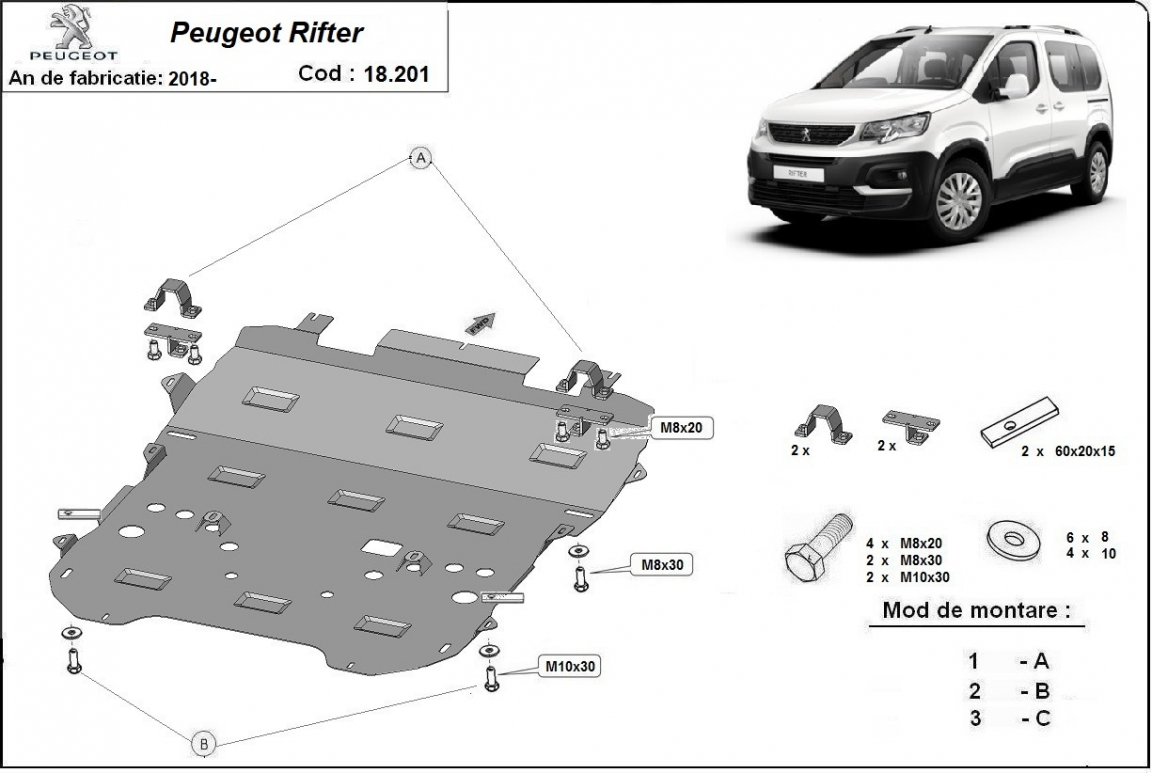 Protection sous moteur et de la boîte de vitesse Peugeot Rifter / Partner (2018-2026)